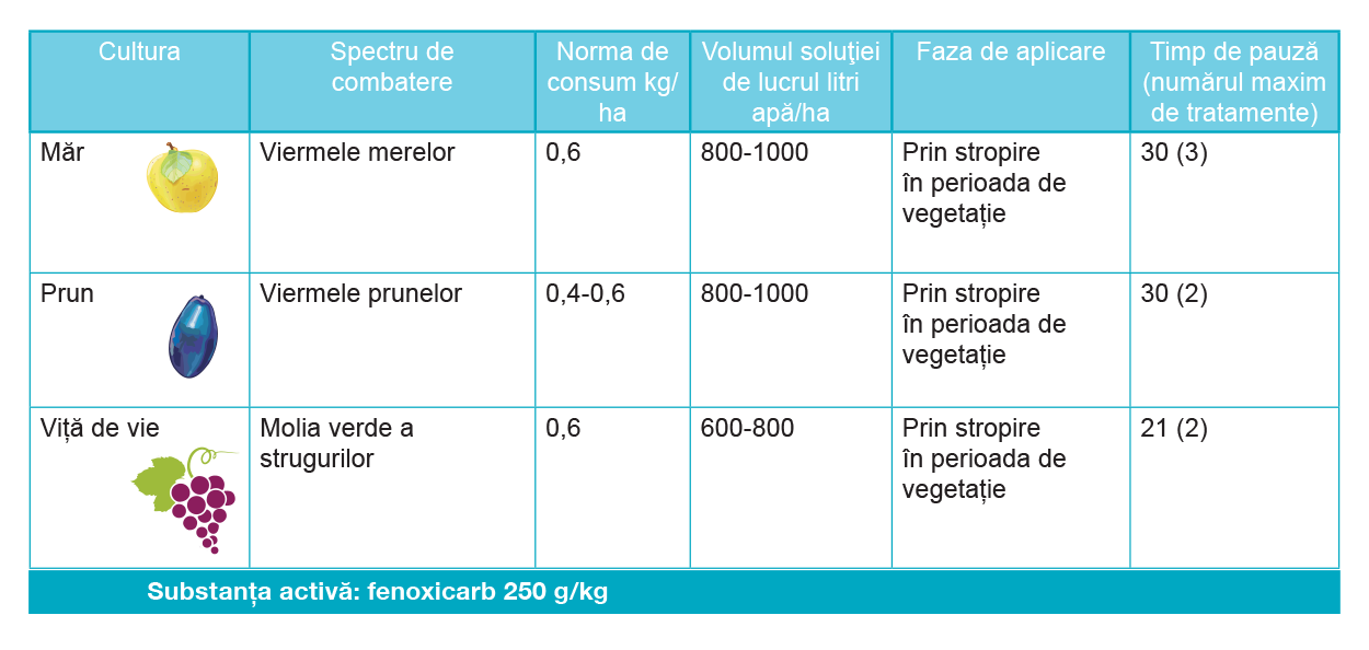 Compoziție: 250 g/kgfenoxicarb Familia chimică: Carbamate Certificat de omologare №:: 01-0381 Formulare: WG (granule dispersabile în apă) Mod de acțiune: ContactIngestie Produsul acționează ca regulator de creștere al insectelor (IGR) prin contact și ingestie, blocând transformarea ouălelor în larve și a pupelor în adulți. Este rezistent la spălare şi posedă o acţiune de lungă durată (20-30 zile). Reduce numărul indivizilor din generaţiile următoare. Details
