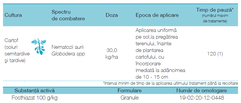 Compoziție: 100 g/kgfostiazat Familia chimică: Organofosforice Certificat de omologare №:: 19-02-20-12-0448 Formulare: WG (granule dispersabile în apă) Mod de acțiune: Contact Details