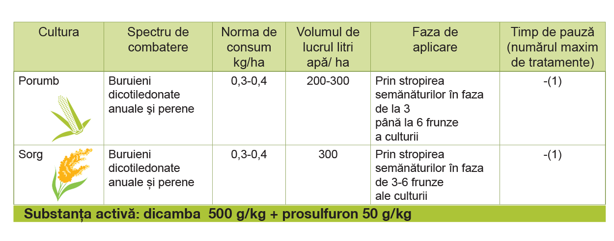 Compoziție: 500 g/kgdicamba50 g/kgprosulfuron Familia chimică: Acizi benzoiciSulfonilureice Certificat de omologare №:: 03-0552 Formulare: WG (granule dispersabile în apă) Detalii