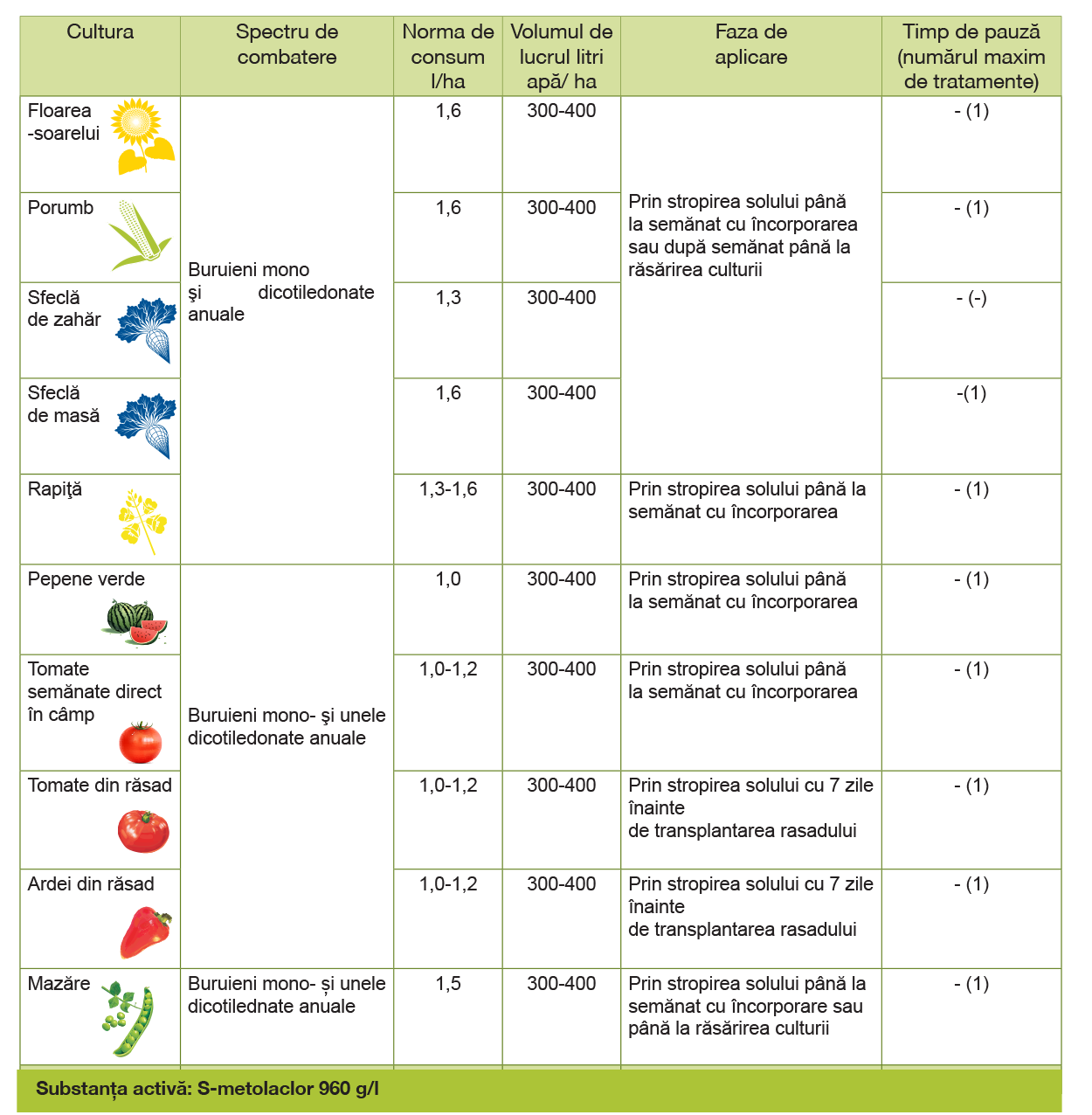Compoziție: 960 g/ls-metolaclor Certificat de omologare №:: 20-09-17-03-0792 Formulare: EC (concentrat emulsionabil) Detalii
