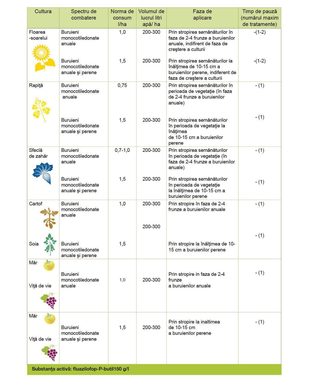Compoziție: 150 g/lfluazilofop-P-butil Familia chimică: Ariloxiphenoxi propionați Certificat de omologare №:: 03-0511 Formulare: EC (concentrat emulsionabil) Mod de acțiune: Sistemic Este absorbit rapid prin aparatul foliar și translocat în întreaga plantă, către vârfurile de creştere ale rădăcinilor și lăstarilor. Buruienile își încetează creșterea în câteva zile de la aplicare. Detalii