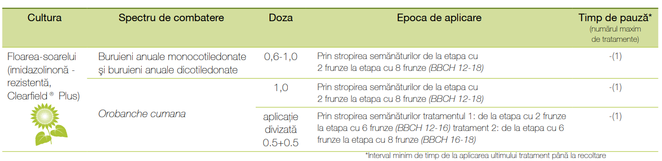 Recomandări de aplicare La floarea-soarelui care conține gena CLHA Plus (rezistentă la imidazolinonă, Clearfield® Plus), 0,6-1,0 l/ha din formulare se utilizează post-emergent, de la stadiul de 2 frunze la stadiul de 8 frunze al culturii.Perioada optimă de aplicare este stadiul de 1-3 frunze la buruienile anuale monocotiledonate și 2-4 frunze la buruienile anuale dicotiledonate.Se va utiliza 1,0 l/ha de la stadiul de 2 frunze la stadiul de 8 frunze a culturii pentru a controla Orobanche cumana.Aplicația împărțită (0,5 + 0,5 l/ha) poate fi utilizată și la stadiile de 2-6 și respectiv 6-8 frunze ale culturii. Trebuie respectat un interval de cel puțin 7 zile între aplicații.În cazul unei infestări abundente, 1,0 l/ha trebuie utilizat pentru combaterea speciilor de buruieni mai dezvoltate sau împotriva buruienilor dificil de controlat.Formularea poate fi utilizată în aceeași solă, o dată la fiecare trei ani.