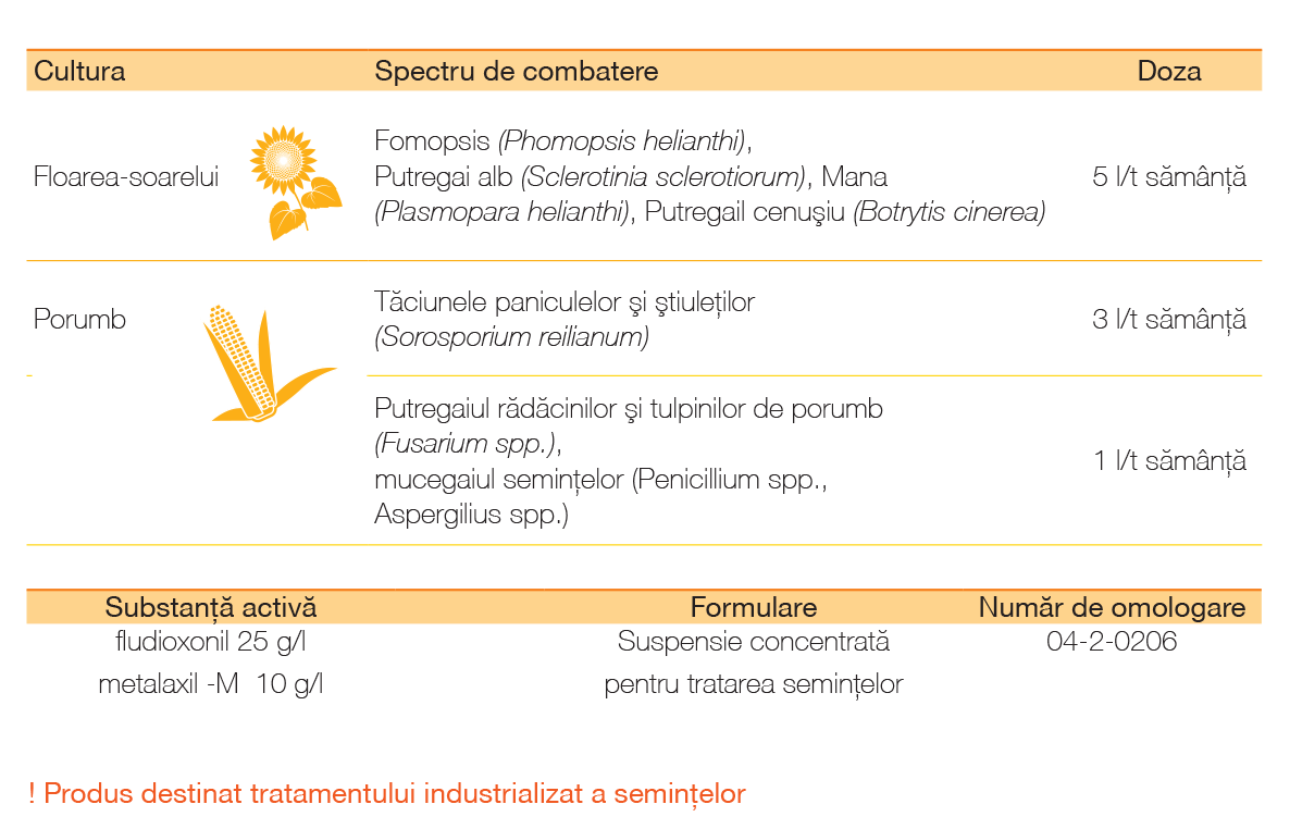 Fungicid pentru tratamentul semințelor de porumb și floarea-soarelui. Este un produs cu două substanţe active diferite după acţiune şi grupă chimică. Protejează plantula tânără de eventualele infecţii de pe suprafaţa şi interiorul seminţelor precum şi din zona germinativă. Materialul semincer poate fi tratat din timp sau cu câteva ore înainte de semănat. Datorită formei preparative şi calităţii înalte a produsului este foarte comod de utilizat şi uniform distribuit pe suprafaţa seminţelor. Nu afectează capacitatea germinativă.