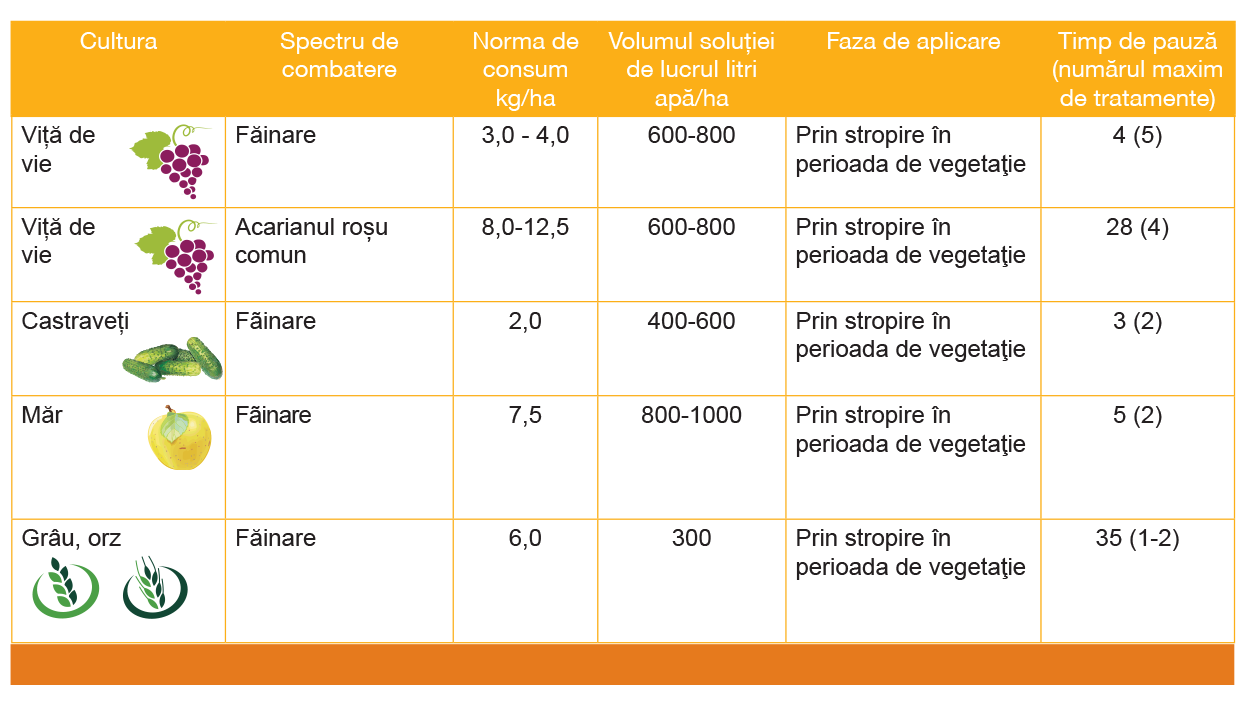 Avantaje Este recomandat ca fungicid, dar posedă și eficacitate pentru acarieni și ca macroelement (sulf) pentru plantă. Flexibil în administrare. Element indispensabil în programele de antirezistențã . Eficacitate biologicã înaltã și de lungã duratã (7-10 zile). Fiind administrat corect, nu este fitotoxic pentru planta tratatã. Permis pentru utilizare în producția ecologică