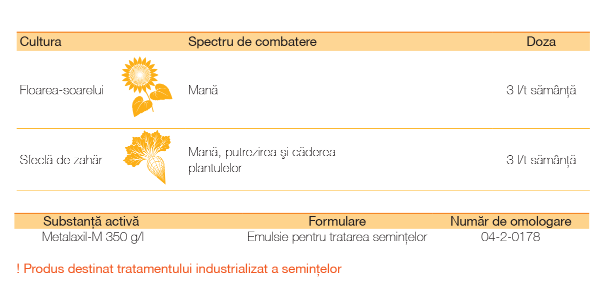 Compoziție: 350 g/lMetalaxil-M Certificat de omologare №:: 04-2-0178 Formulare: EW (emulsie pentru tratarea semințelor) Mod de acțiune: Sistemic Детально