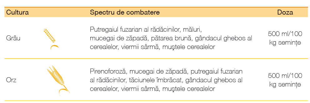 Recomandat pentru tratamentul semințelor de grâu și orz, unde dăunătorii foliari apar în mod frecvent. Fludioxonil este un fungicid de contact non-sistemic, din clasa fenilpiroli. Are activitate reziduală de lungă durată. Inhibă în mare măsură germinarea conidiilor și creșterea miceliului. Teflutrin este un insecticid de contact și cu acţiune prin vapori, din clasa piretroizilor. Acționează ca un repelent la unele specii de Coleoptere. Asimilarea în plantă, precum și translocarea sunt limitate. Acționează asupra sistemului nervos al insectelor și perturbă funcția neuronală prin interacțiuni la nivelul canalelor de sodiu.