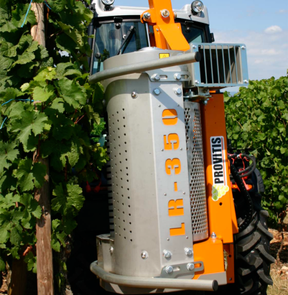 Рабочая высота 480 мм. Головка для зачистки листьев установлена на раме параллелограмма, обеспечивающей соблюдение плоскости растительности. Турбины и ролик приводятся в движение гидравлическими двигателями. Устройство для зачистки листьев LR 350 может быть приспособлено к любому типу носителя, трактору для виноградников, трактору с высоким клиренсом или даже к уборочной машине для винограда.