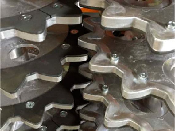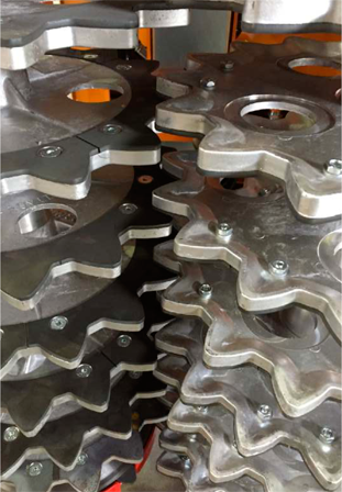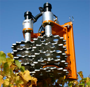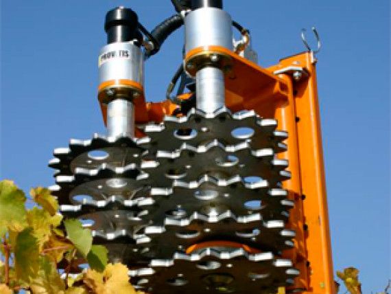 Преимущества: Форма диска обеспечивает хорошее сцепление с побегами винограда и регулярную подачу машины без повреждения шпалеры. Расстояние 60 мм. между дисками благоприятствует чистке проводов. Небольшое техническое обслуживание, небольшой вес (от 145 до 270 кг) и низкий расход. Уменьшенные брызги из-за низких скоростей вращения. Нижняя часть дисков абсолютно плоская, предотвращая отрывание почек на прицепах.
