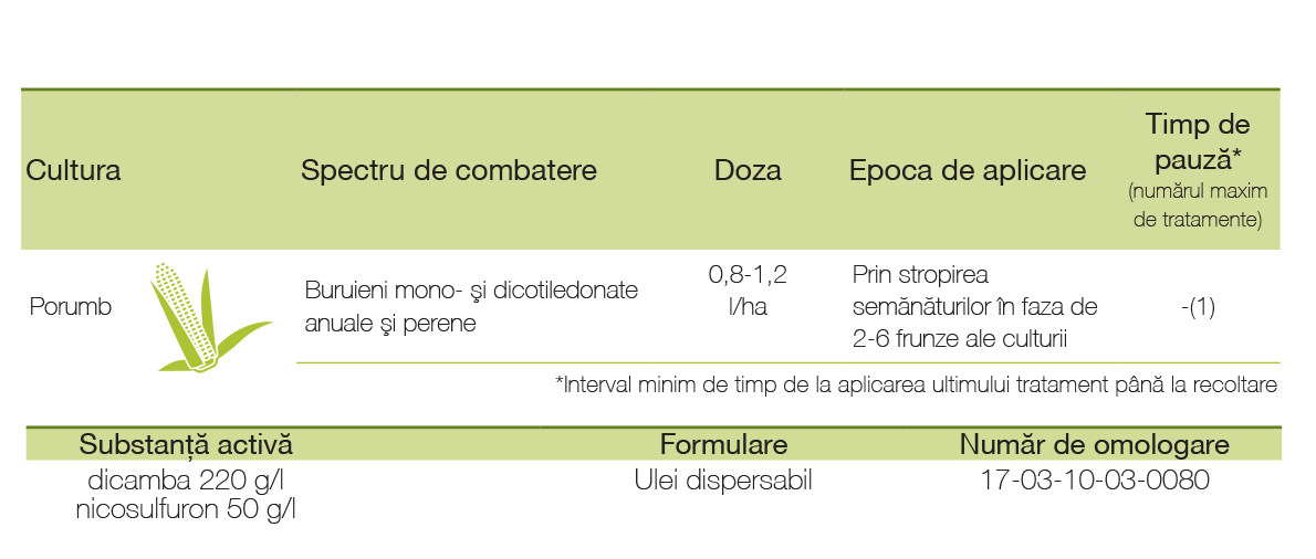 Recomandări de aplicare Buruieni perene: se recomandă aplicarea în doză maximă de 1,2 L/ha.A nu se utiliza produsul în producerea de samânță și pentru porumbul zaharat.În funcţie de stadiul de dezvoltare al porumbului faza optimă de aplicare este între 2 frunze (BBCH 12) până la stadiul de 6 frunze (BBCH 16).Porumbul pentru boabe sau furaj poate fi resemănat imediat în cazul compromiterii culturii tratate cu Milagro® Plus, după efectuarea unei arături adânci.Cerealele de toamnă şi rapiţa se pot semăna în toamnă.Sfecla de zahăr, sorgul şi floarea-soarelui se vor semăna în primăvară (la 1 an după aplicarea tratamentului cu Milagro® Plus), după efectuarea arăturii.