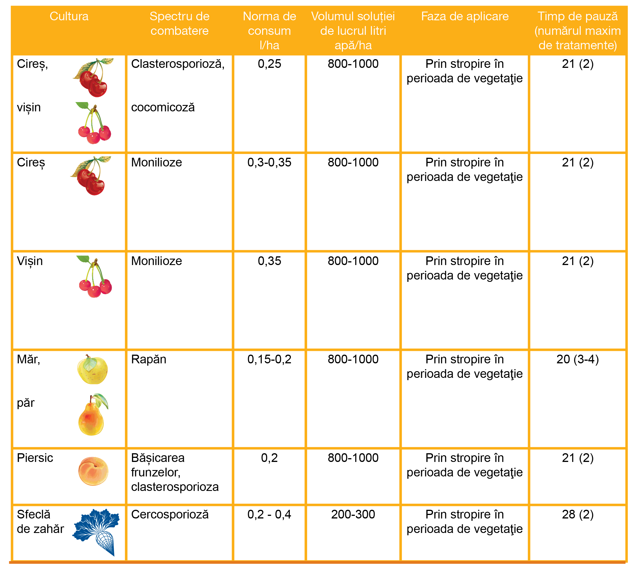 AVANTAJE Este un produs strategic în tot sistemul de protecție a plantațiilor pomicole. Cel mai sigur dintre toate produsele din grupa chimică a triazolilor. Flexibil în perioadele de administrare.Este recomandat să fie utilizat în amestec cu un fungicid de contactEste compatibil cu alte produse de uz fitosanitar. Eficacitate înaltă la costuri minime.